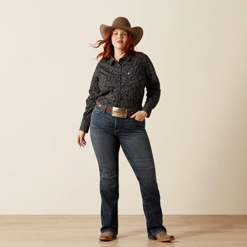 Połączenie kobiecego fasonu, komfortu i zachwycających detali westernowych – koszula Kirby Stretch – Black Boot Stitch to idealna opcja dla kobiet, które szukają uniwersalnej i stylowej koszuli nadającej się zarówno na co dzień, jak i na bardziej wyróżniające się okazje.