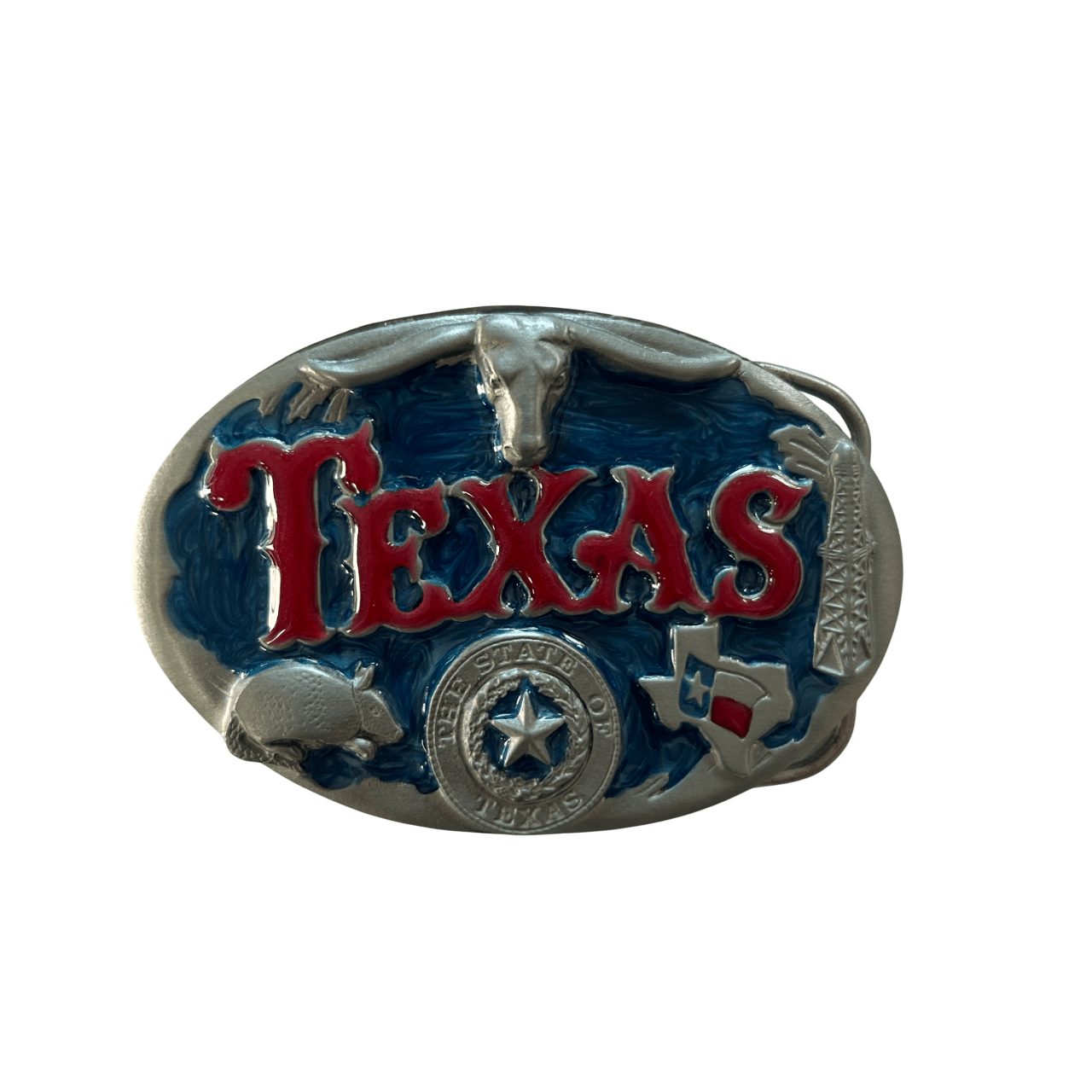 Wyrazista i nie do przeoczenia – ta klamra to hołd dla dumy stanu Teksas. Centralne miejsce zajmuje różowy, emaliowany napis TEXAS, który kontrastuje z niebieską emalią w tle, przyciągając spojrzenia i podkreślając oryginalny styl właściciela.