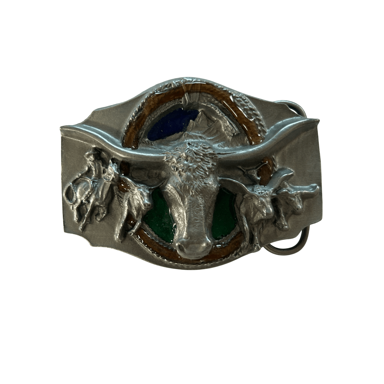 Ta efektowna klamra do paska to prawdziwy klasyk stylu western. Centralnym elementem jest imponująca głowa bydła, otoczona obwolutą w kształcie splecionego lassa – symbolu kowbojskiej tradycji i życia na prerii.