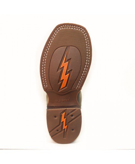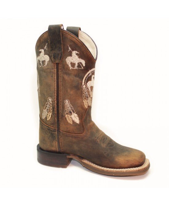 Brązowe skórzane buty z beżowymi przeszyciami: łapacze snów i kowboj. Idealny dla małych kowbojów w Twoim domu.