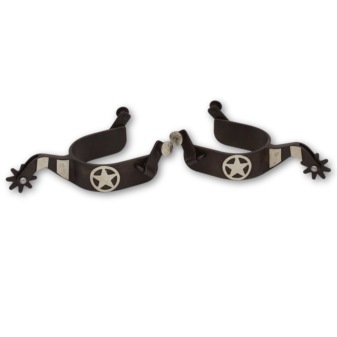 Solidne ostrogi w stylu western, wykonane z ciemnobrązowego metalu, z subtelnymi zdobieniami i kultową gwiazdą Teksasu – stylowy klasyk dla jeźdźców w stylu western, którzy zwracają uwagę na szczegóły.