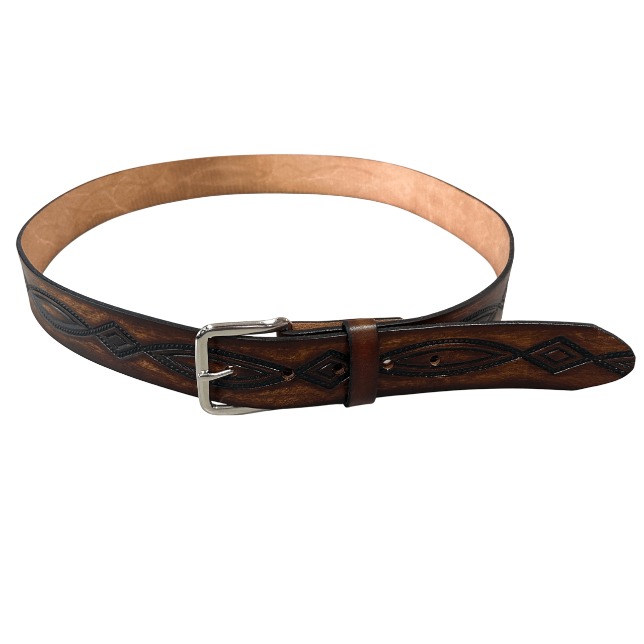 Wyjątkowy pasek męski wykonany z ciemnobrązowej skóry naturalnej. Ozdobny wzór tłoczony w romby nadaje mu niepowtarzalnego charakteru i przyciąga wzrok, podkreślając styl inspirowany Dzikim Zachodem. Solidne, srebrne nity oraz masywna (wymienna) metalowa klamra gwarantują trwałość i wygodę noszenia.