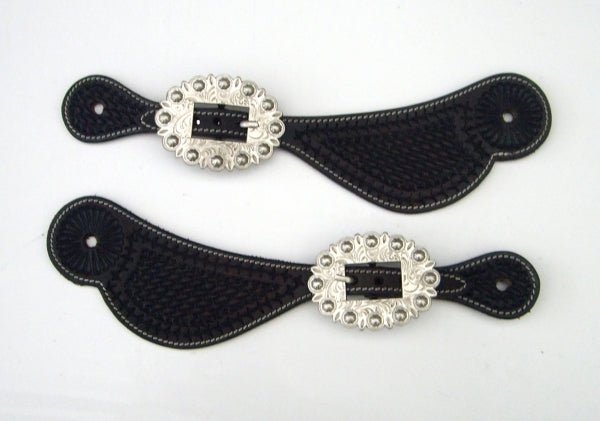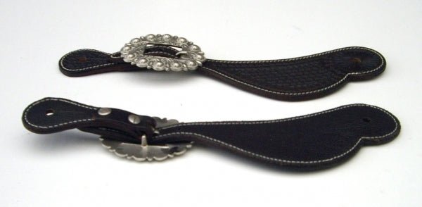 Wysokiej jakości skórzane paski do ostróg, w ciemnym brązie, zapinane dużą srebrną klamra.