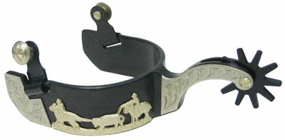 Czarne stalowe ostrogi wystawowe z ręcznie grawerowanym srebrnym wykończeniem i wzorem w kształcie liny.