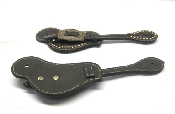 Wysokiej jakości paski do ostróg wykonane ze skóry, ozdobione tłoczeniami, szeroką klamra oraz nitami w kolorze miedzi.